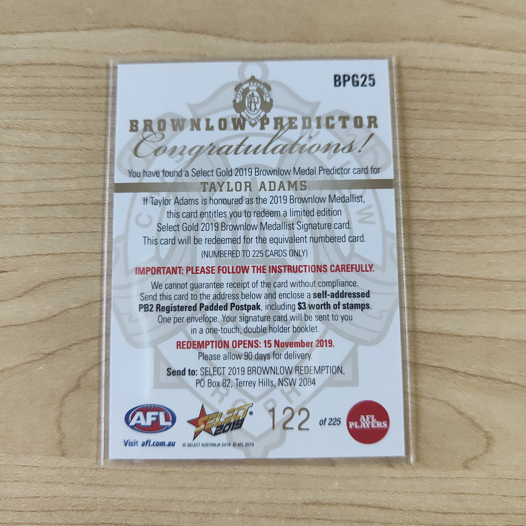 2019 AFL Select Brownlow Predictor Taylor Adams Collingwood No.122/225