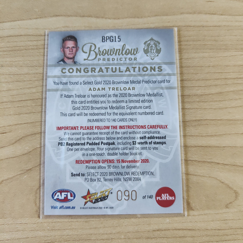2020 AFL Select Brownlow Predictor Adam Treloar Collingwood No.090/140