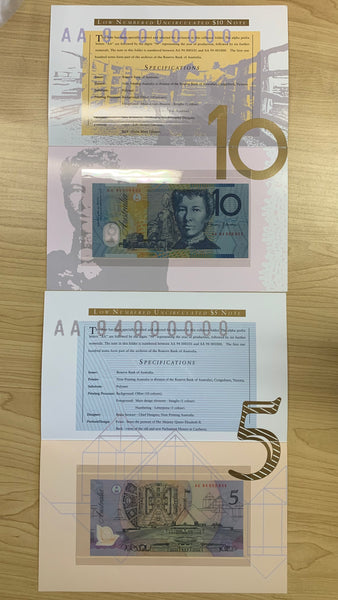 1994 Low Numbered Uncirculated Premium $5 and $10 Australian Banknotes Folders with Matching Serial Numbers