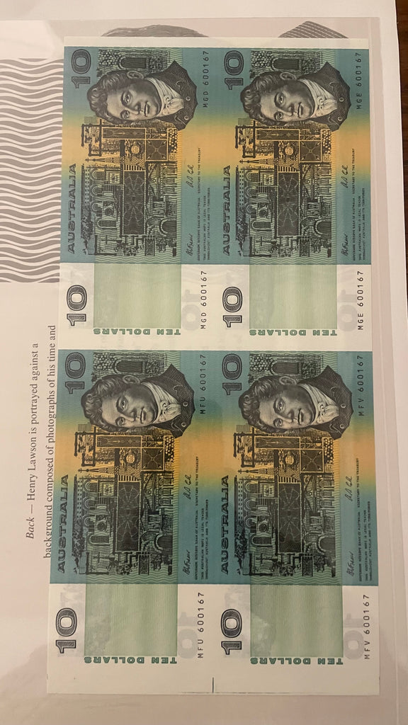 Australia 1991 $10 Fraser/Cole Banknote Uncut Block of 4 Folder R313