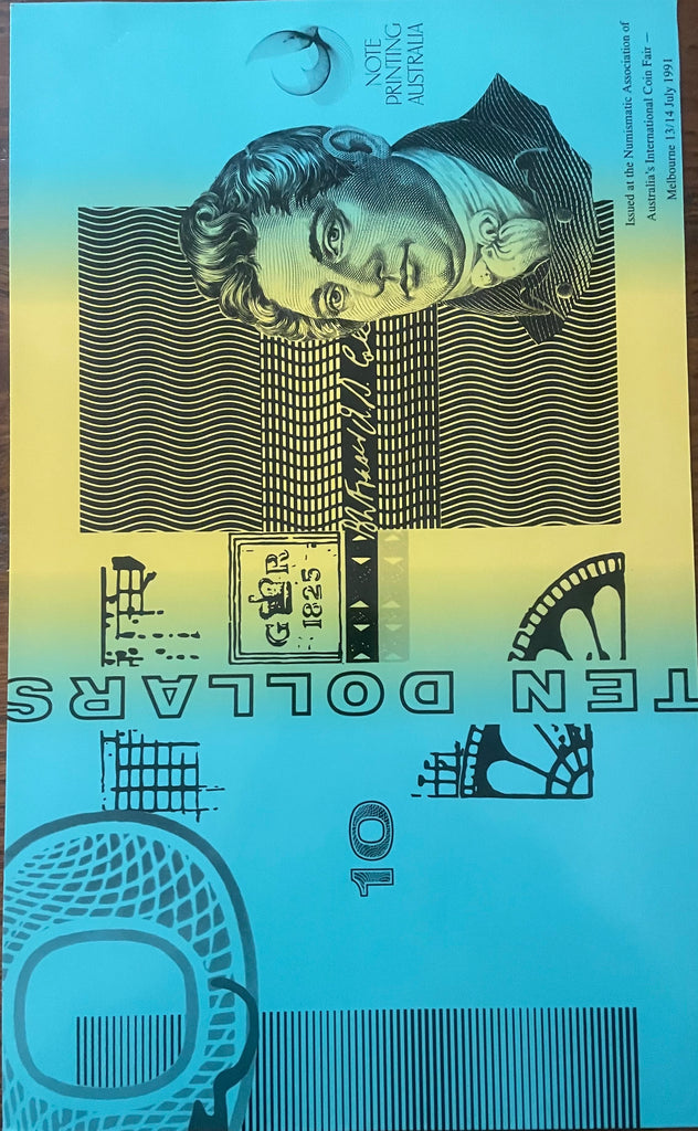 Australia R309 $10 Fraser/Cole Uncut Block of 4 Banknotes  with the same serial number.  Issued for Melbourne International Coin Fair 13/14 July 1991
