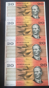 Australia $20 R409a OCRB Johnston Fraser Run of 4 Slight Centre Fold Uncirculated Banknotes