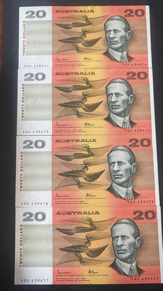 Australia $20 OCRB Johnston Fraser Consecutive Run of 4 Uncirculated Banknotes R409a