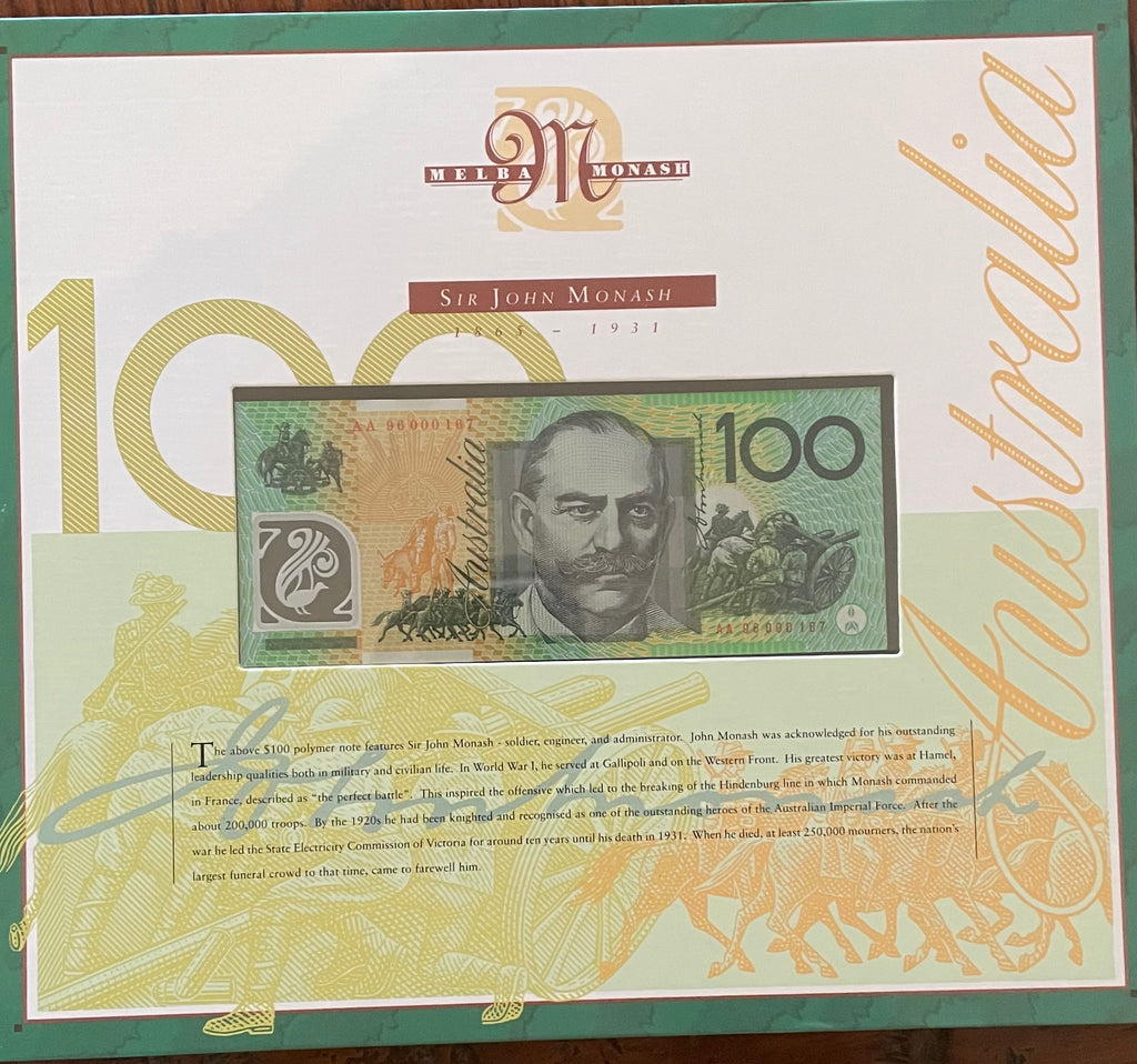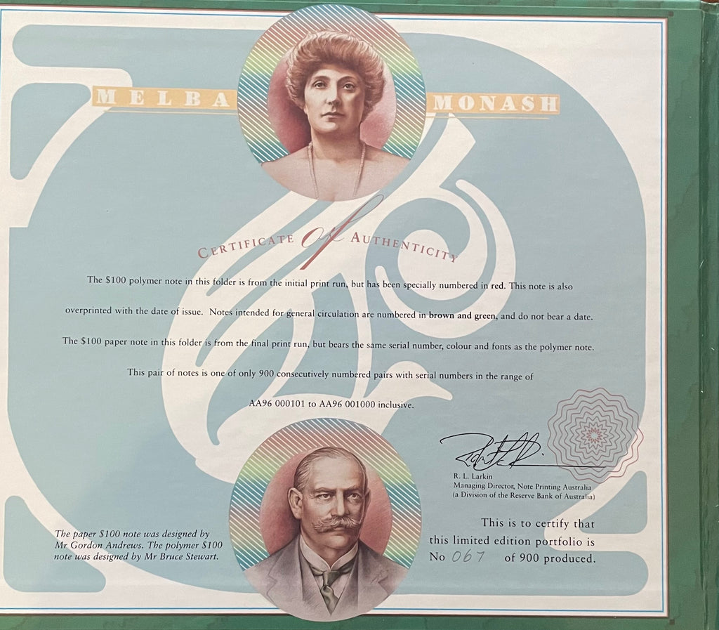 Australia 1996 $100 Last Paper and First Polymer Uncirculated Banknote Portfolio Red Serial Numbers