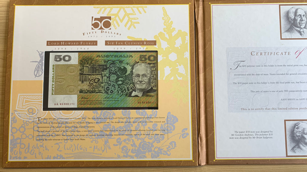 Australia 1995 $50 Paper & $50 Polymer Banknote Folder only 900 made