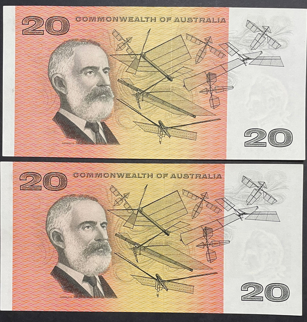 Australia 1974 $20 Phillips Wheeler Consecutive Pair Banknotes Uncirculated R405