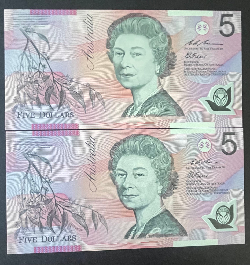 Australia 1995 $5 Evans Fraser Polymer Banknote Uncirculated Pair R217AA