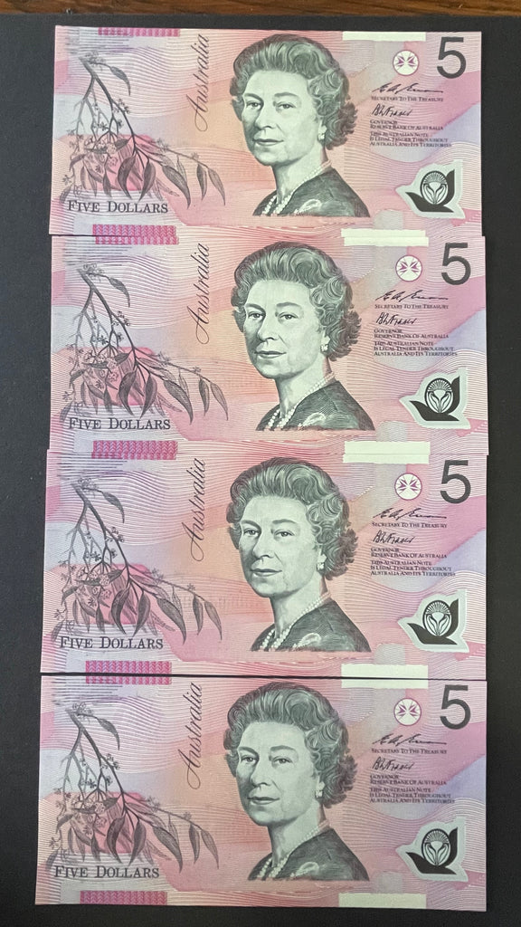 Australia 1995 $5 Evans Fraser Polymer Banknote Uncirculated Run of 4. R217bL