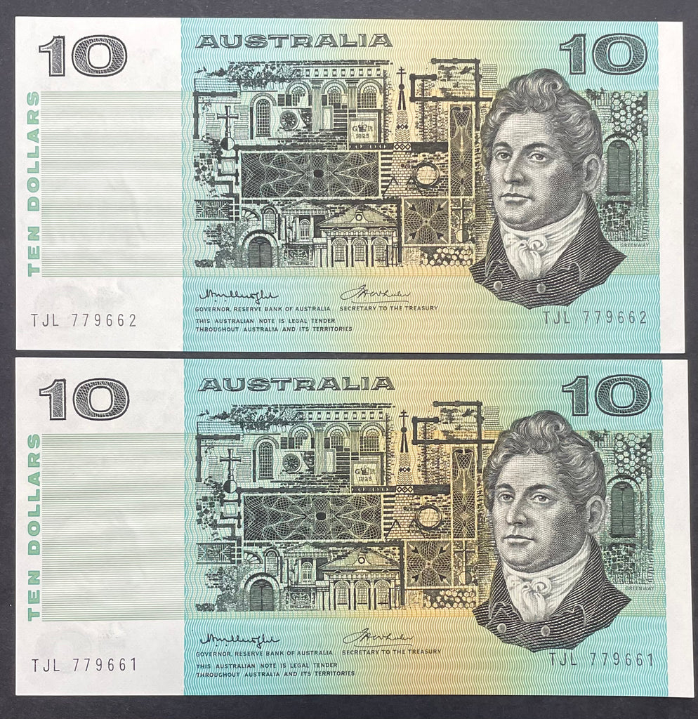 R306a Australia $10 Banknote Knight/Wheeler Centre Thread Consecutive Pair Uncirculated.