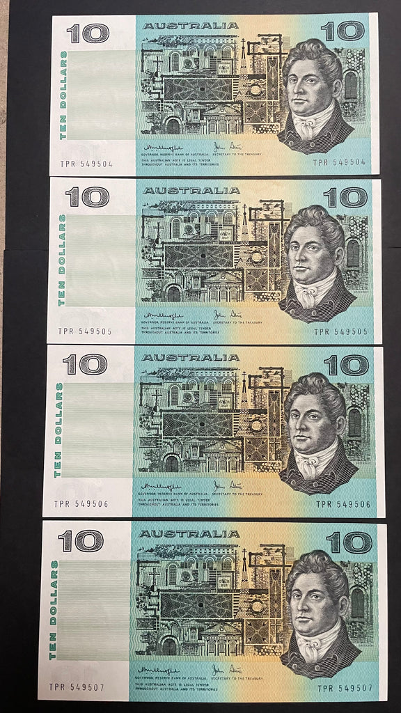 Australia $10 Banknote Knight Stone, Gothic Serial Numbers Uncirculated Run of 4 R307a