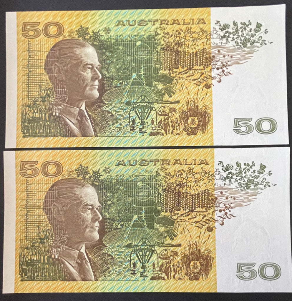 R513a 1990 $50 Australia Fraser/Cole Uncirculated Banknote consecutive Pair without Plate Letter.