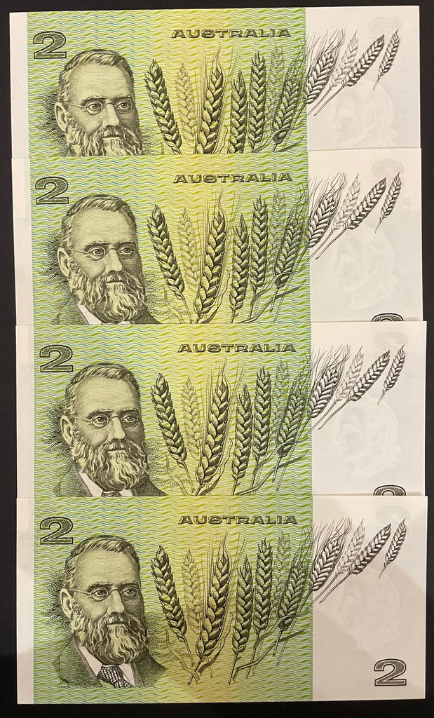 R85 $2 Australia Run Of 4 Consecutive Banknotes very light centre fold almost Uncirculated .