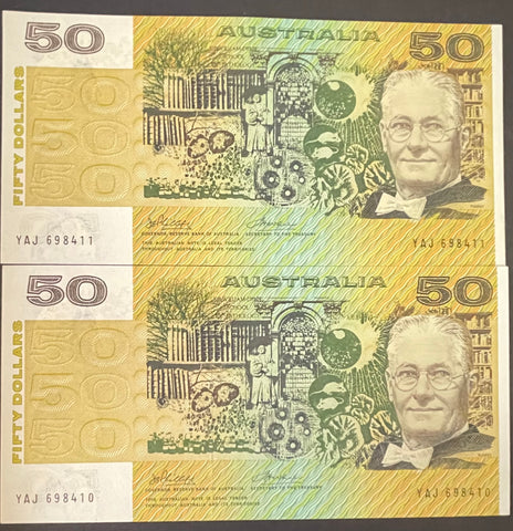 Australia 1990 $50 Fraser Higgins Banknote Uncirculated Pair R512