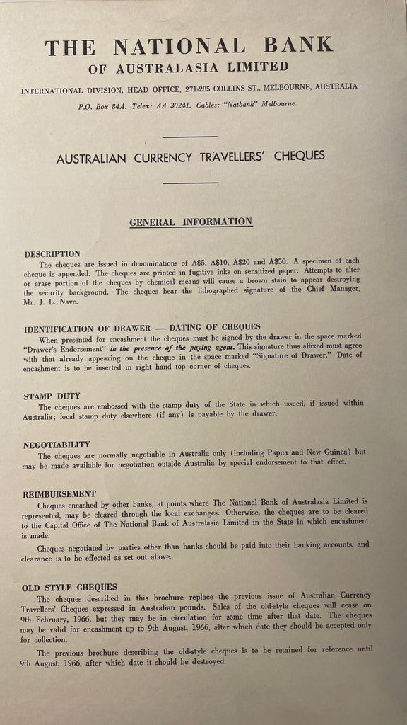 1965 Australia National Bank $5, $10, $20 & $50 Travellers Cheque Overprinted Specimen in official folder. First Decimal Set.