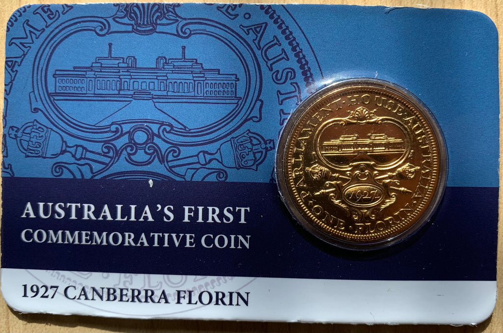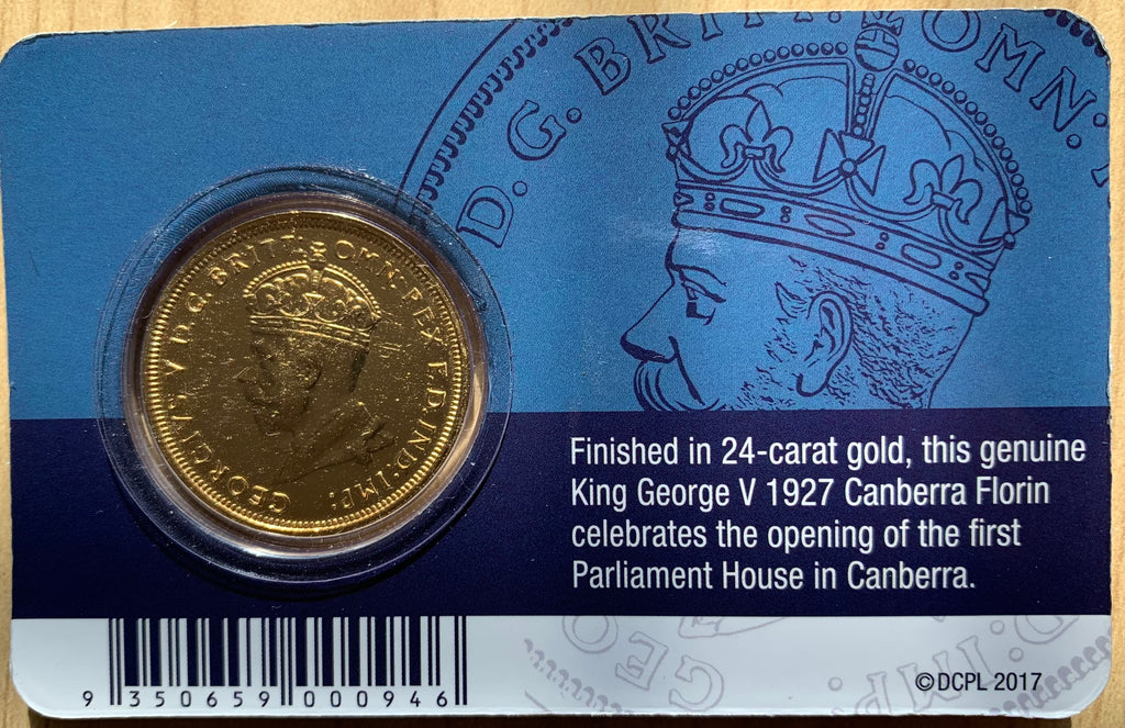 1927 Australia Gold Plated 2/- Florin Canberra Commemorative 2/- in card.