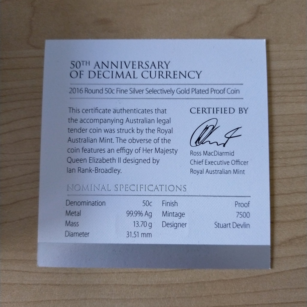 2016 RAM 50c 50th Anniversary Decimal Currency Gold Plated Silver Round Fifty Cent Proof Coin