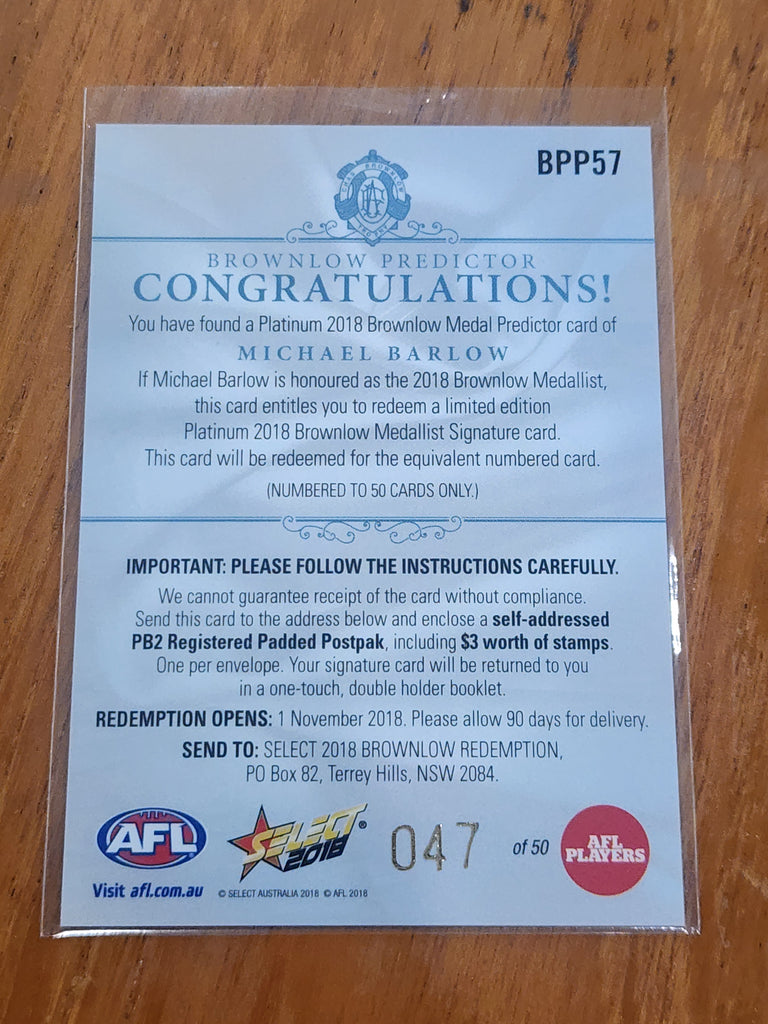 2018 AFL Select Platinum Brownlow Medal Predictor Michael Barlow Gold Coast BPP57 047/50