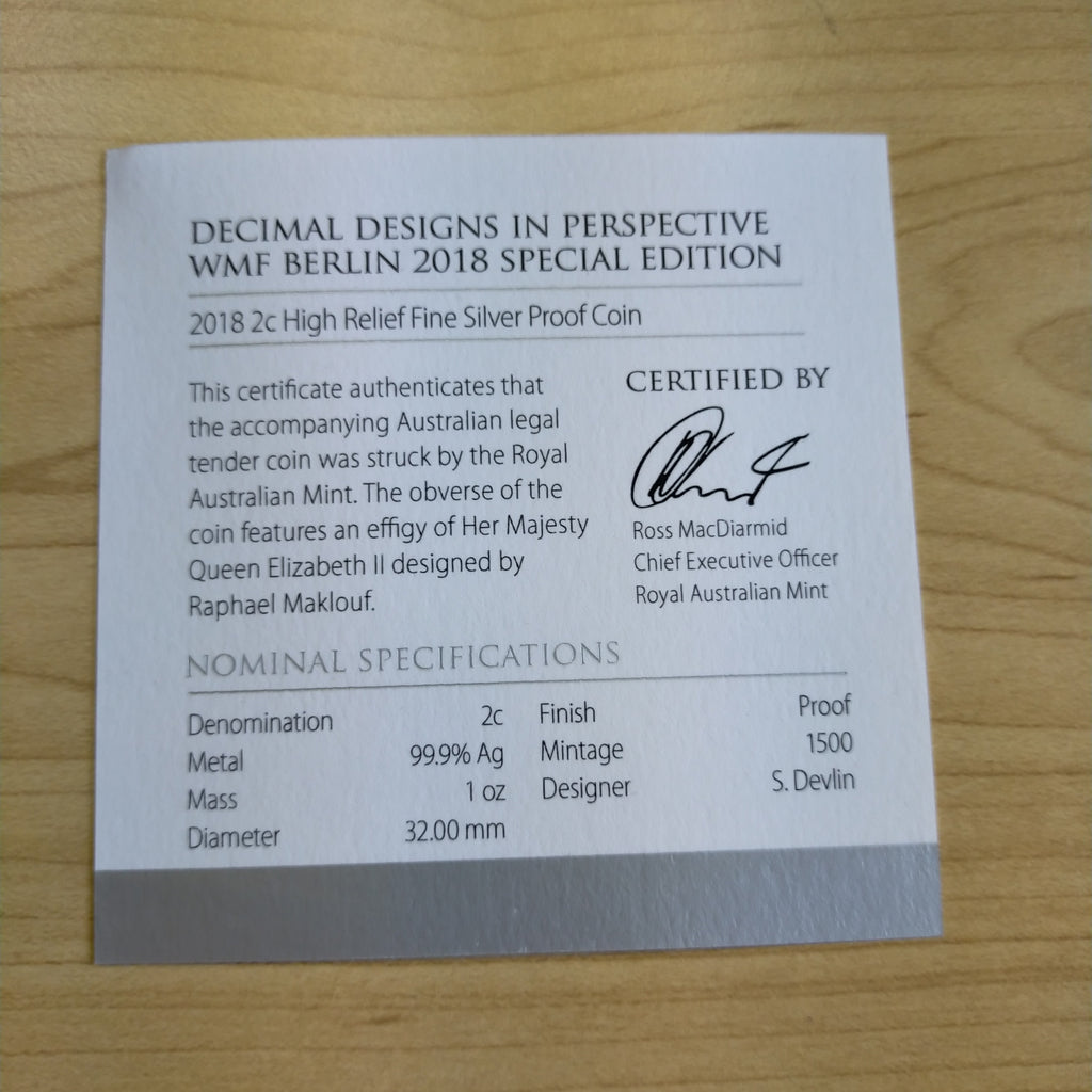 2018 Royal Australian Mint 2c Decimal Designs In Perspective High Relief 1oz .999 Silver Proof Coin