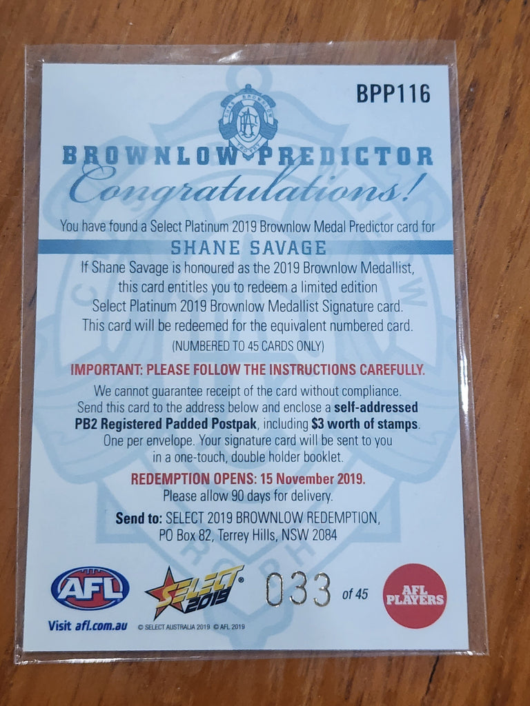 2019 AFL Select Platinum Brownlow Medal Predictor Shane Savage St Kilda BPP116 033/45