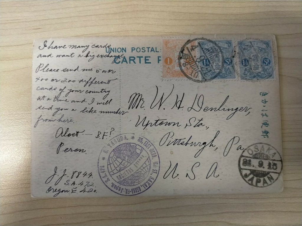 Japan 1915 Vintage Postcard "Toyokawa Meishiyo" posted Osaka to USA
