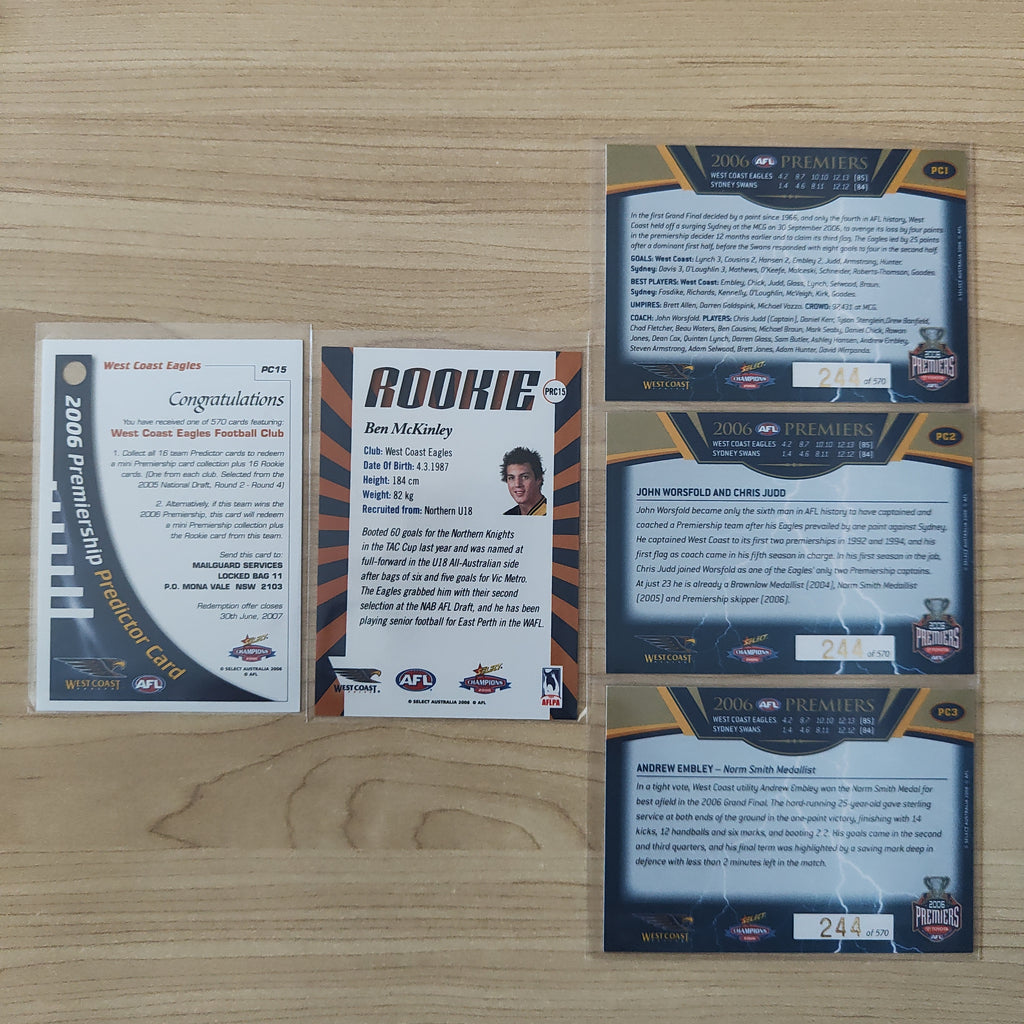 2006 Select Champions Premiership Predictor Card West Coast + Benjamin McKinley Rookie Card 244/570