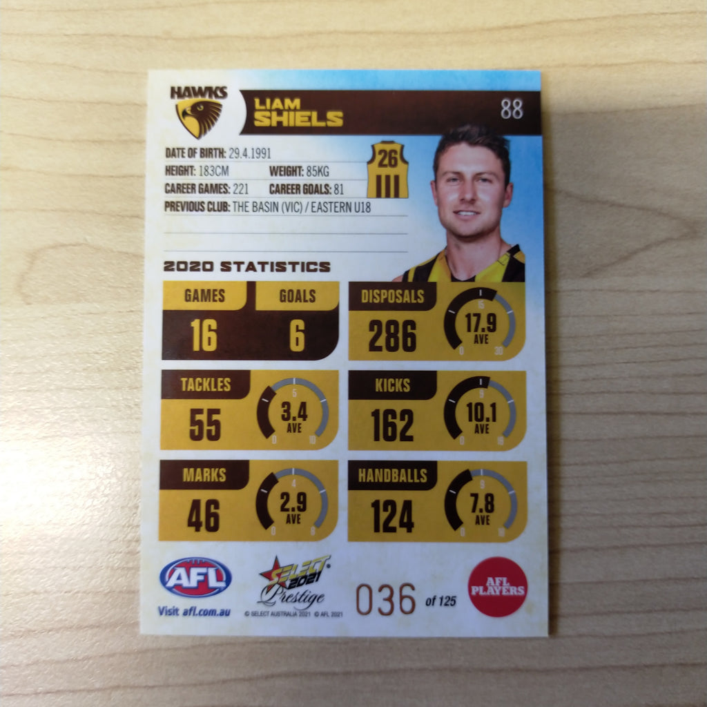 2021 AFL Select Prestige Blue Parallel Liam Shiels Hawthorn No.36/125