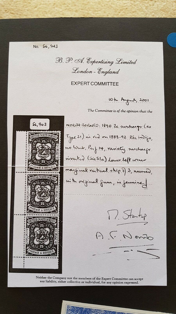 North Borneo 1890 2 cent surcharge in red on 1888 25c Arms with inverted surcharge Error and 2 certificates of authenticity. Sent with Standard Delivery - Registered. Please check ourother listings for more Stamps, Coins, Banknotes, Australian Football,Militaria, Medals and other Collectables. We stock a huge range of accessoriesfor these products including Albums and Catalogues. We do combine post.If making multiple purchases please contact us for an invoice. Pickup is available Tuesday to Friday. Pleasecontact us first to arrange a time. We can organise Saturday pickup ifnecessary.