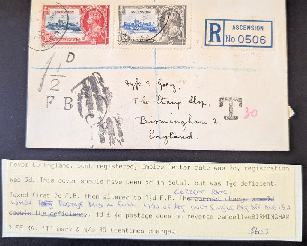 Ascension 1935 Silver Jubilee Registered Cover to The Stamp Shop Birmingham England