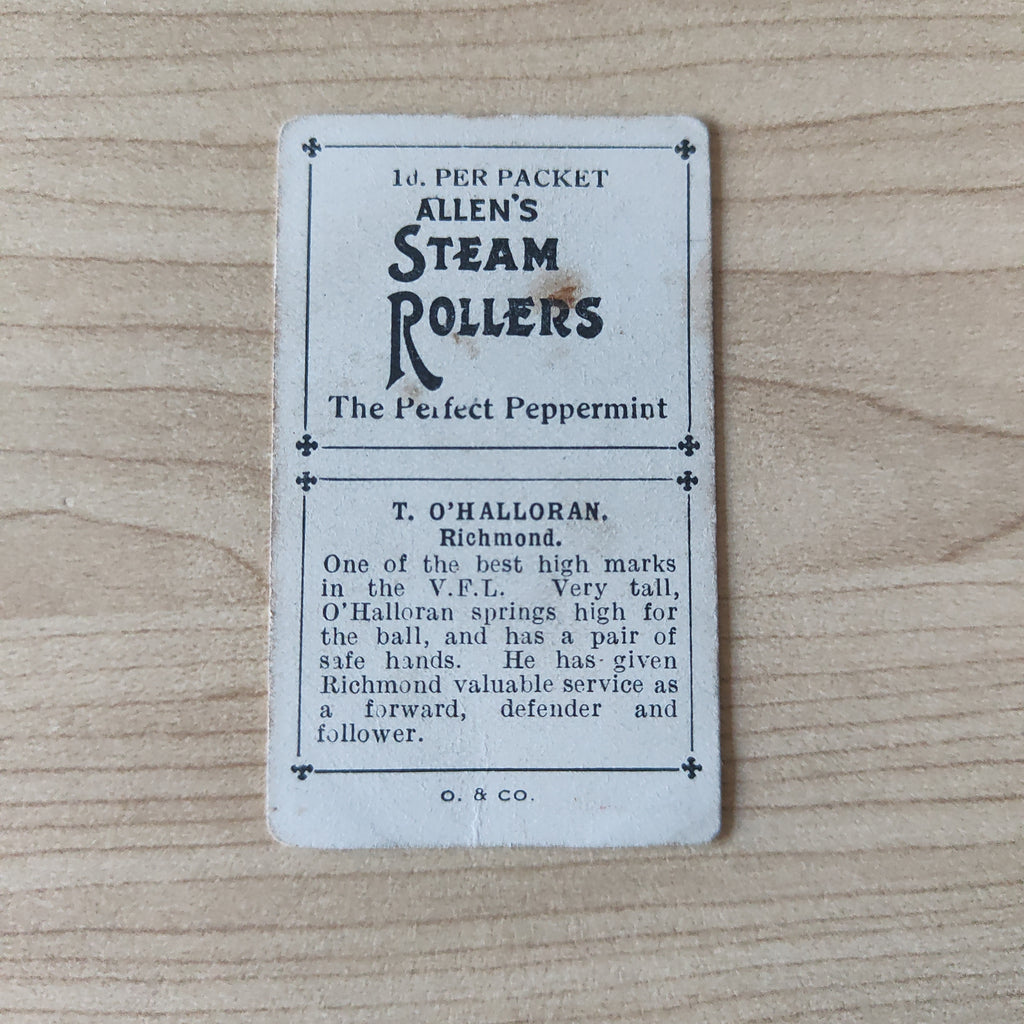1934 VFL Football Allens Pennants T O'Halloran Richmond Cigarette Card