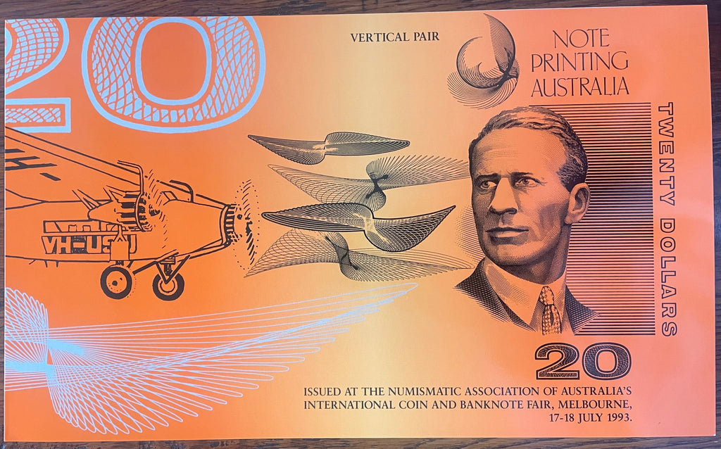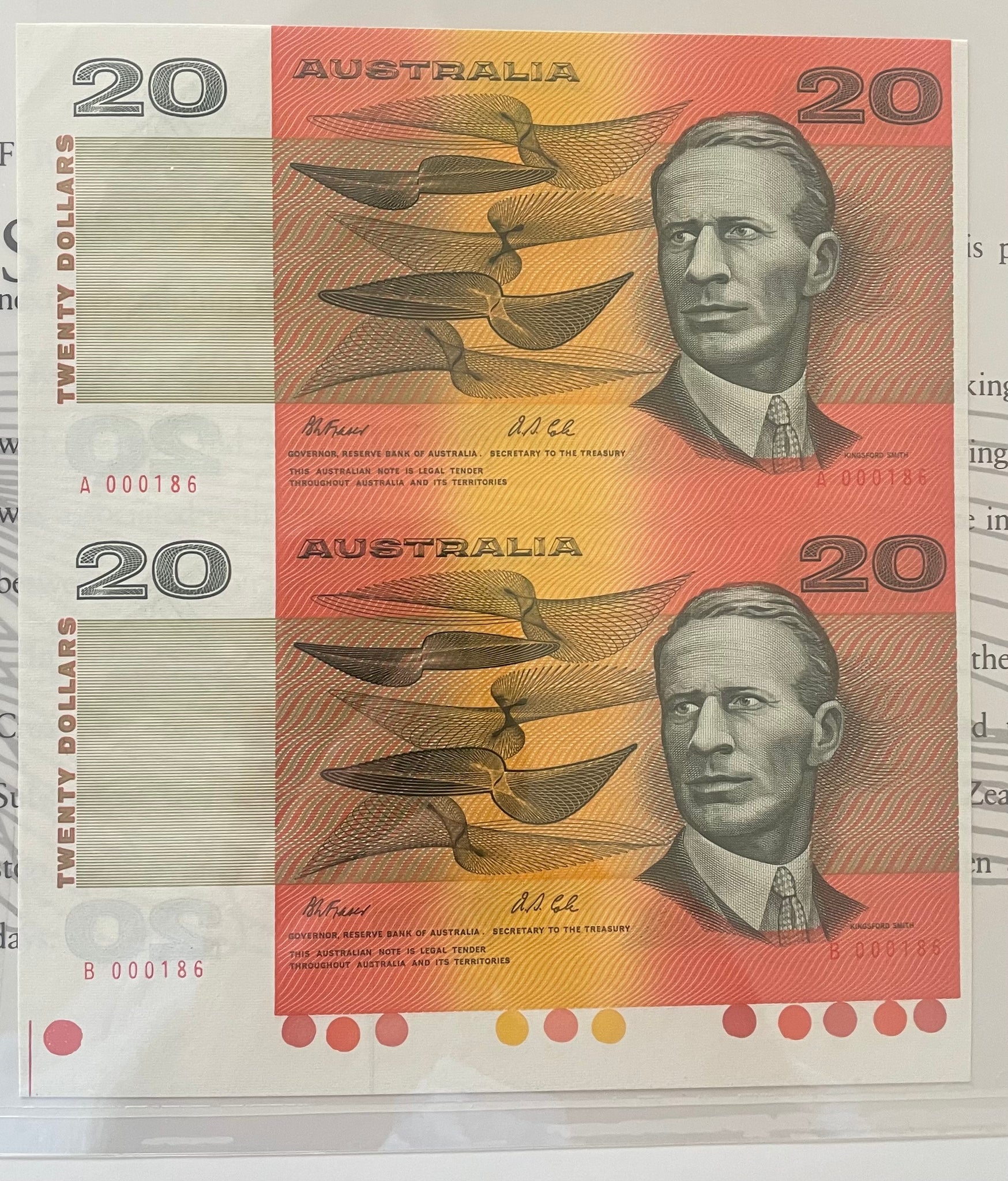$20 Fraser Cole vertical pair with red serial consecutive numbers. International Coin and Banknote Fair Melbourne 17-18 July 1993. You may receive a different serial number to the one pictured.