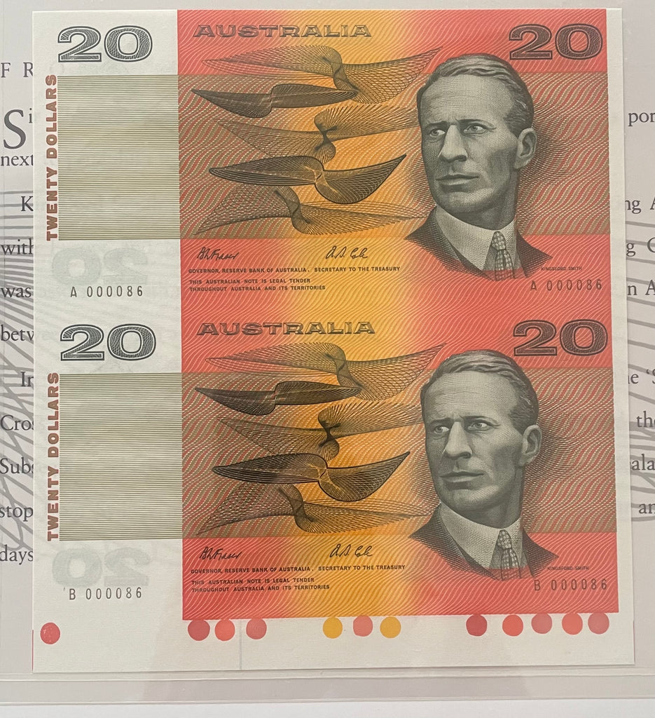$20 Fraser Cole vertical pair with red serial consecutive numbers. International Coin and Banknote Fair Melbourne 17-18 July 1993