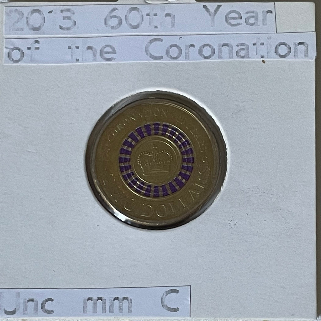 2013 60th Anniversary of the Coronation of Her Majesty Queen Elizabeth II $2 'C' Mintmark Coloured Uncirculated Coin without card.