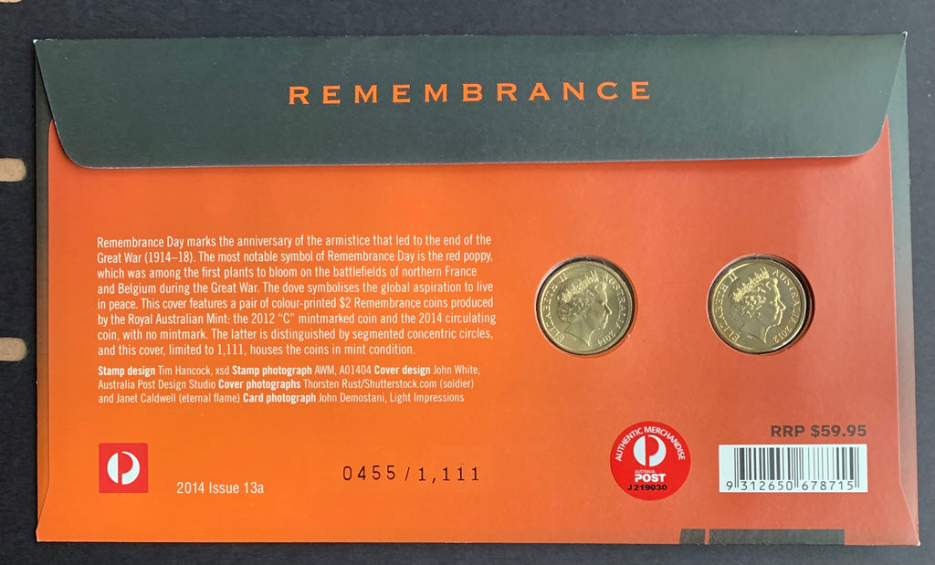 2014 & 2012 Remembrance Day $2 Coloured Coins PNC
