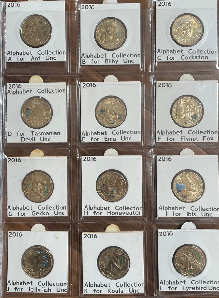 Australia Royal Australian Mint 2016 Aussie Alphabet Coloured $1 coins Complete Collection of 26 mounted in 2 x 2 mounts