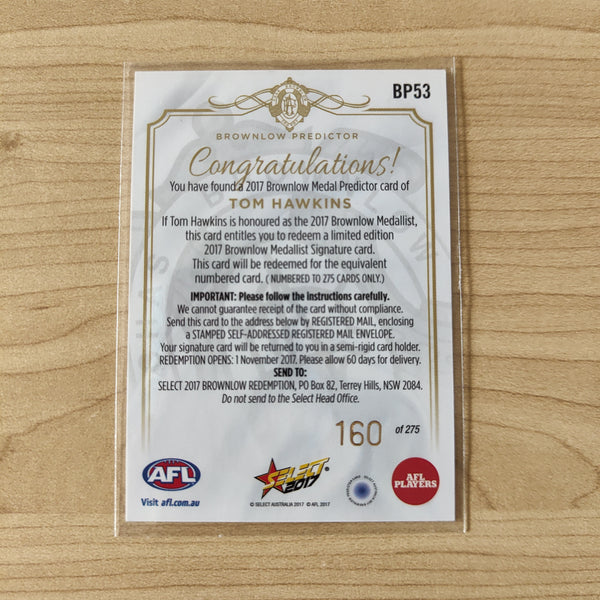 2017 Select Footy Stars Brownlow Predictor Tom Hawkins Geelong 160/275