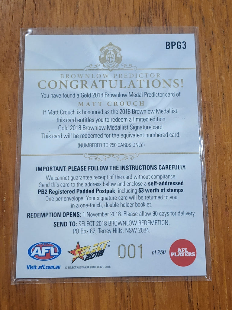 2018 AFL Select Gold Brownlow Predictor Matt Crouch Adelaide LOW 001/250 BPG3