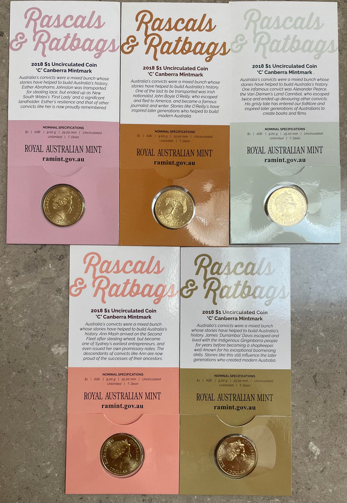 Australia 2018 $1 One Dollar RASCALS & RATBAGS Set of 5 'C' mintmark Coins