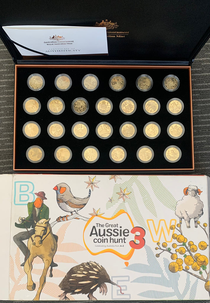 Australia 2022 Royal Australian Mint $1 Great Aussie Coin Hunt 3 Set of 26 Alphabet aluminium-bronze proof Coins displayed in box.