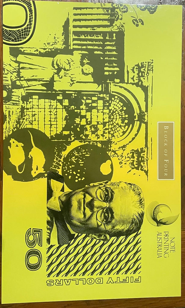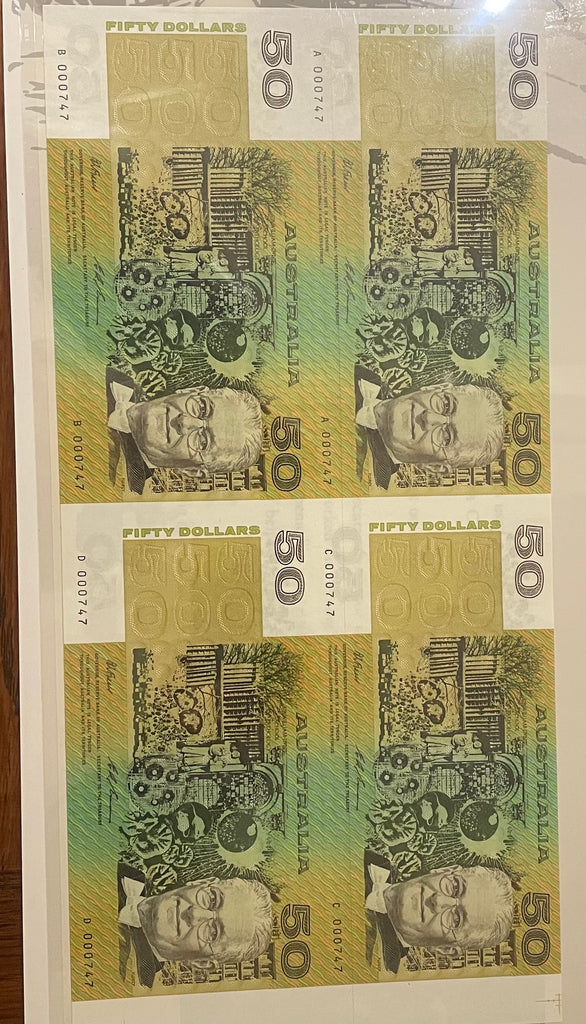 Australia 1994 $50 Paper Uncut Block of 4 Banknotes Black Serial Number In Folder