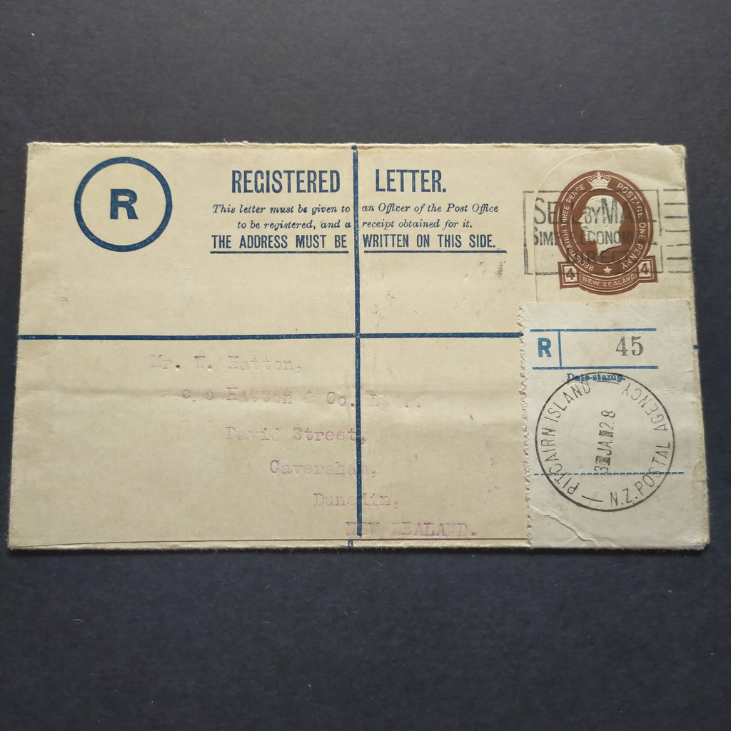 Pitcairn - Dunedin New Zealand Registered Letter bearing NZ agency label.