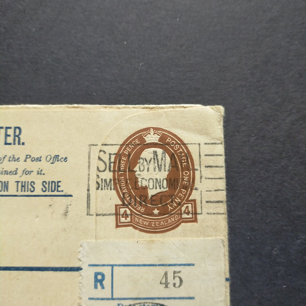 "Registered Letter to Dunedin, New Zealand, bearing registration label No. 45 with Postal Agency c.d.s. of 3 January 1928."